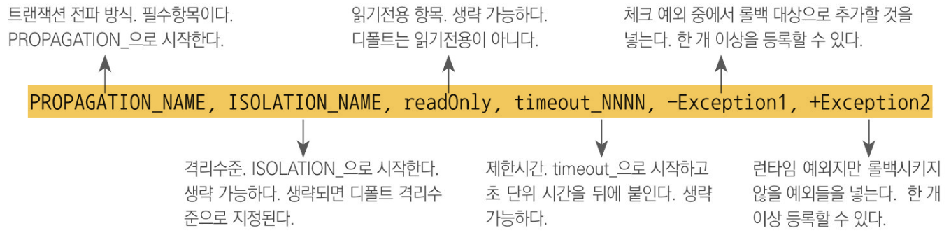 - Properties 타입의 transactionAttributes 프로퍼티는 메소드 패턴과 트랜잭션 속성을 키와 값으로 갖는 컬렉션이다. 트랜잭션 속성은 다음과 같은 문자열로 정의할 수 있다.