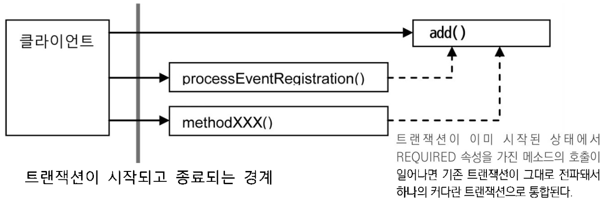 - REQUIRED 전파 속성을 가진 메소드를 결합해서 다양한 크기의 트랜잭션 작업을 만들 수 있고