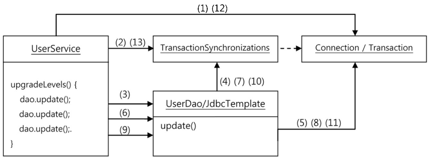 - TransactionSynchronizatoins 저장소는 작업 스레드마다 독립적으로 Connection 오브젝트를 저장하고 관리